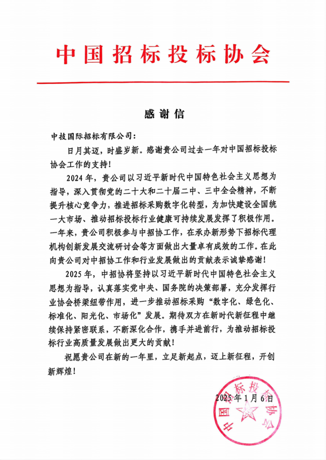 近日,招标公司收到中国招标投标协会发来的感谢信。协会在信中高度评价公司在推动招标采购数字化转型,为全国统一大市场建设和行业高质量发展作出的积极贡献,充分肯定公司在承办重要行业活动中展现的专业实力和卓越成效,并对公司长期以来对协会工作的大力支持表示衷心感谢。这不仅彰显了公司在招标采购行业的综合实力,也进一步巩固了公司作为行业领先企业的地位。2025年,公司将立足新起点,践行央企使命担当,以高质量发展为主线,以创新驱动为动力,继续发挥示范引领作用。在协会的指导和帮助下助力行业数字化、绿色化、标准化、阳光化、市场化建设,为推动招标投标行业高质量发展贡献更大力量。